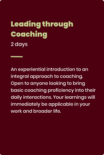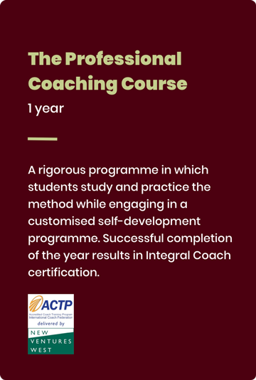 From foundational workshops to our year-long certification program, our suite of accredited Integral Coach training programmes are all customizable to suit your organization’s needs. Below is an overview: